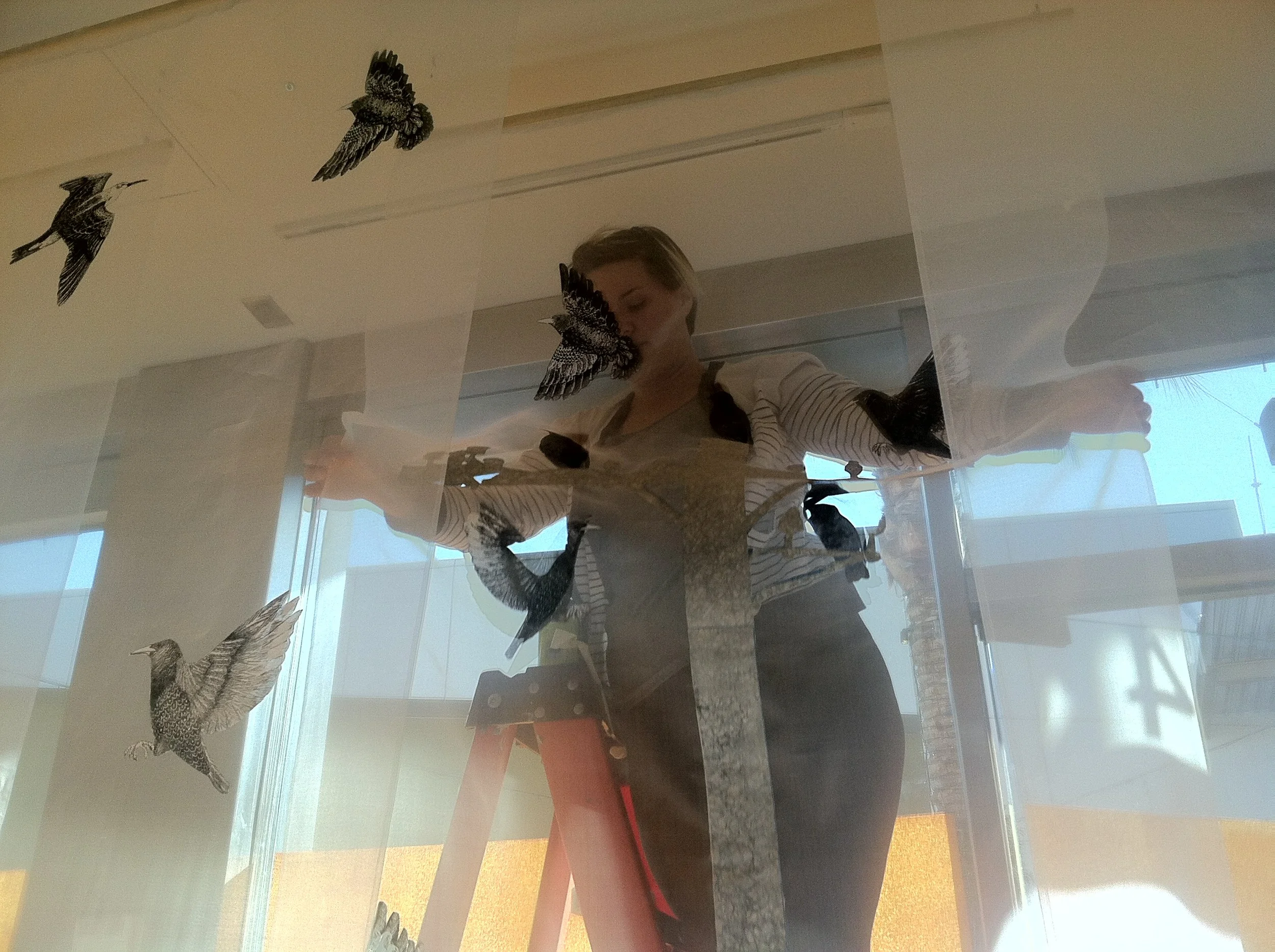 Using collaged images of iconic landscape and architecture found throughout Tempe, together with a roosting bird motif, the artists illustrate connectivity, community, and the ability for people and towns of the valley to flock together. The staggered layers of sheer fabric, adorned with hand printed and collaged imagery, create a sense of depth that is indicative of the expansive community that utilizes Tempe marketplace as a social hub. IN FLUX has provided these budding artists the opportunity to continue to explore installation and site specific art as a team, and to expand their work into a more public setting.